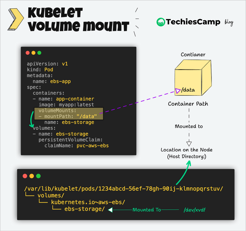 The Kubelet ensures the container inside the pod has access to the volume by binding the mount point to the container's filesystem at the specified path in volumeMounts.