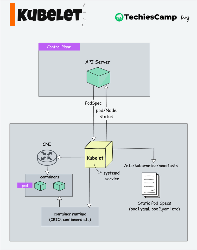 It then continually reports the nodeβs status (e.g., available resources, health, and running conditions) to the API server. This ensures that the control plane, particularly the scheduler, has an up-to-date understanding of the node's capacity and condition.
