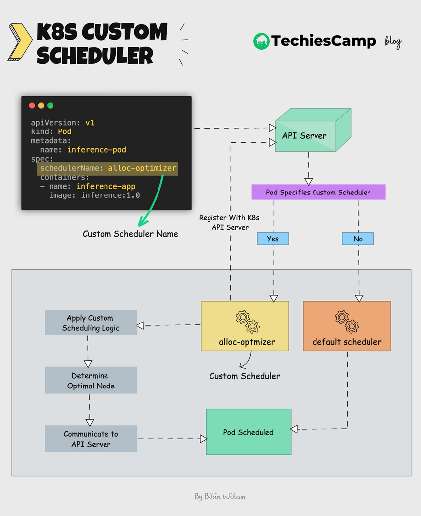 - Once deployed, The custom scheduler registers itself with the Kubernetes API server.