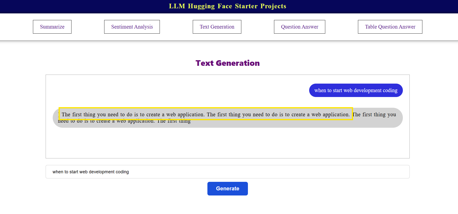 export default TextGenerationThe output renders a repetitive message as shown below: