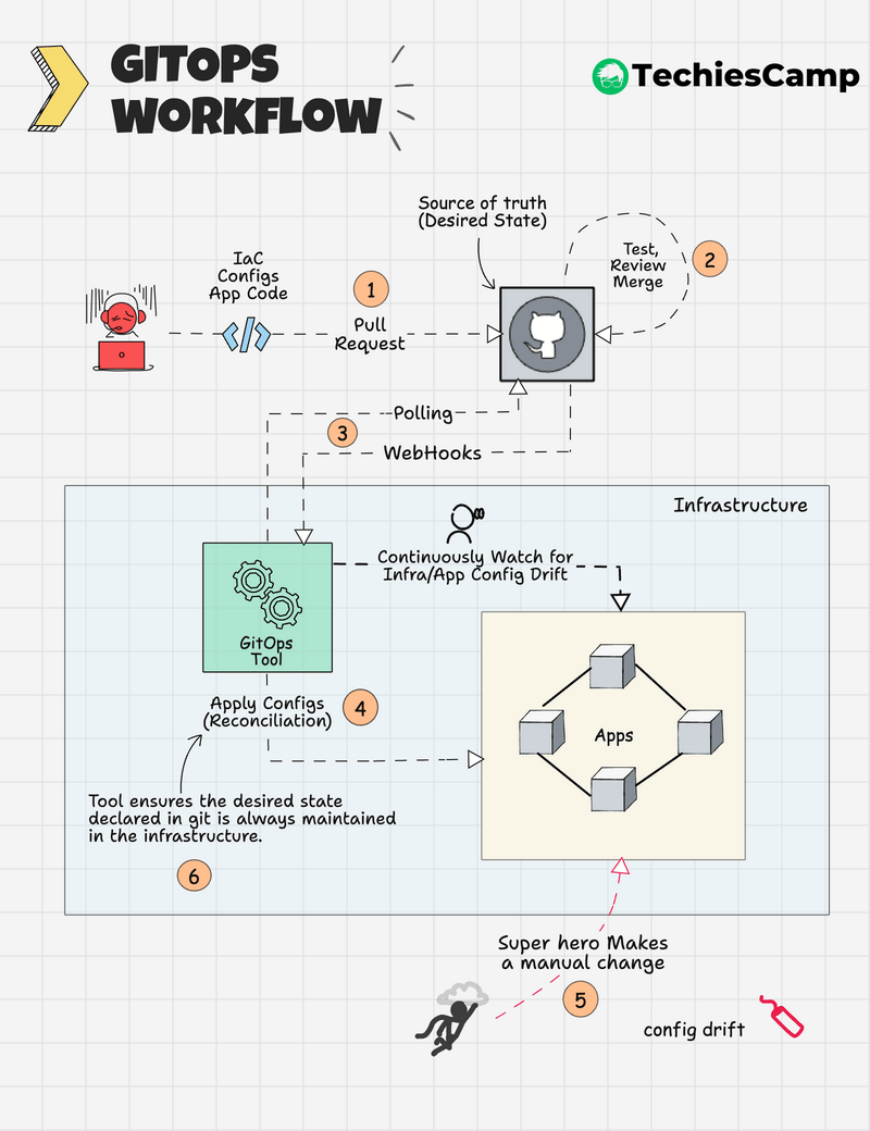 4and12, the GitOps tool identifies the configuration drift compared to the Git configuration. - The GitOps tool then rollbacks the manual changes to match the desired state in Git.