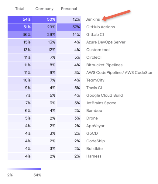 As per the Developer Ecosystem Report, 54% of the developers use Jenkins for CI/CD.