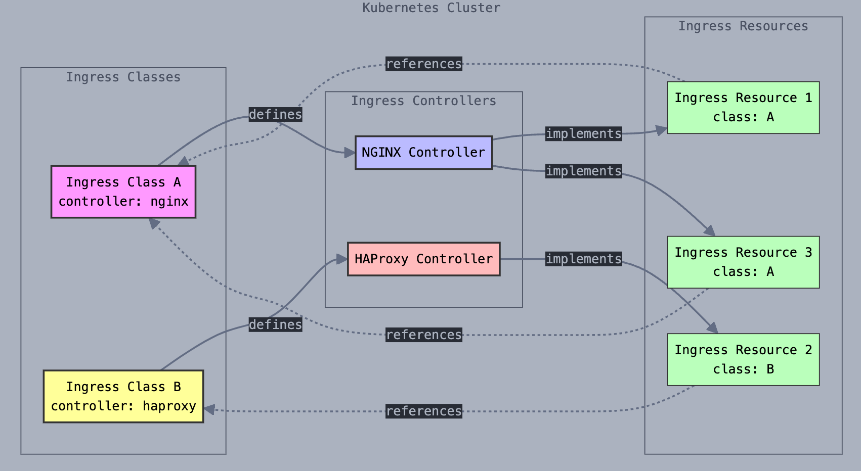 For example, you may be running an Nginx controller and an HAProxy-based controller in the same cluster. The following image shows the use of ingress class names and how it relates to the ingress objects.