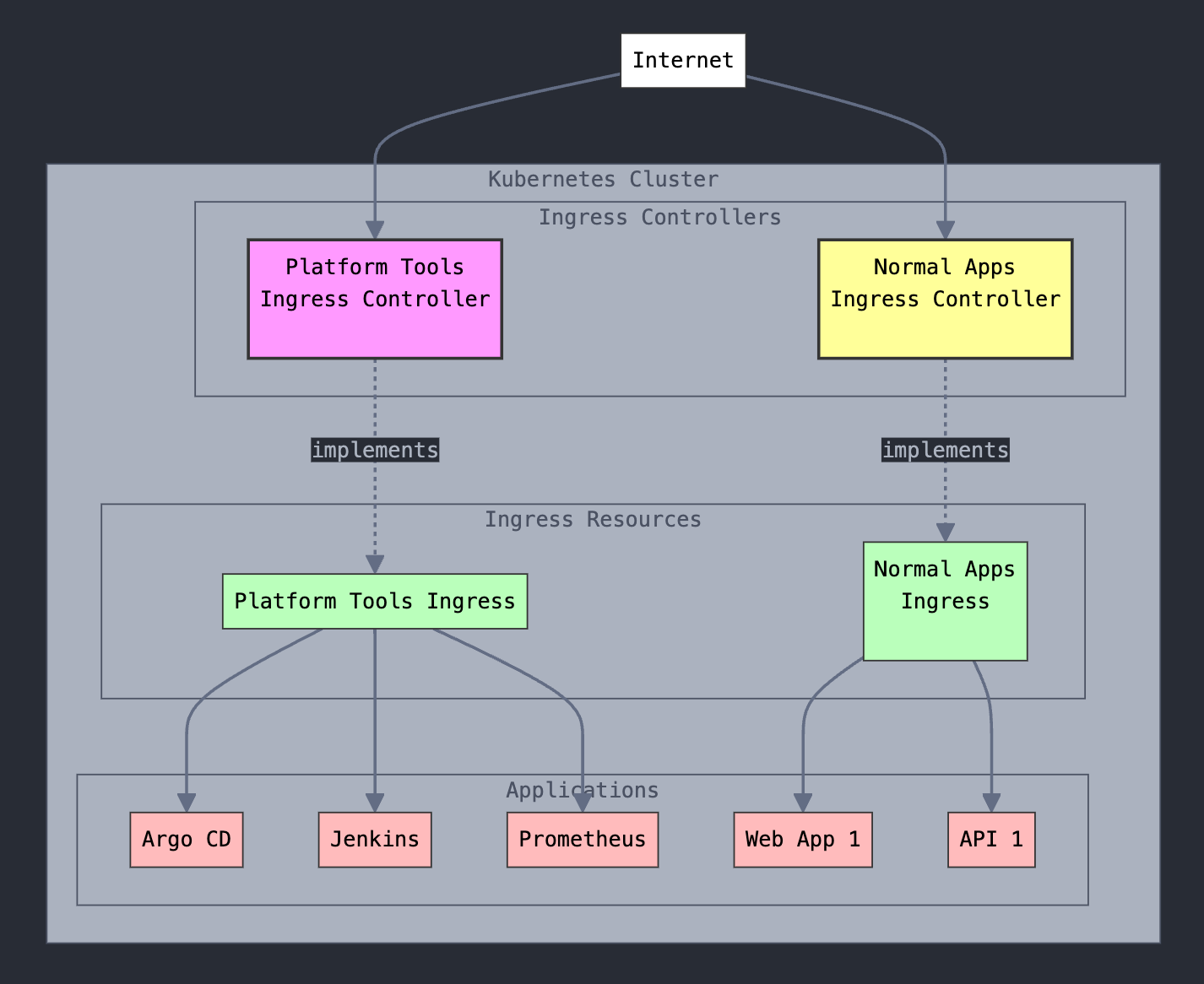 By associating different Ingress resources with different Ingress classes, you can manage traffic management to meet various needs, whether for general applications, platform tools, or compliance-sensitive services.