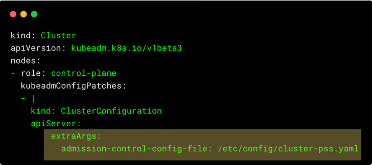 namespaces: [kube-system]The AdmissionConfiguration configuration needs to be added to the API server setup using extraArgs, as highlighted below.