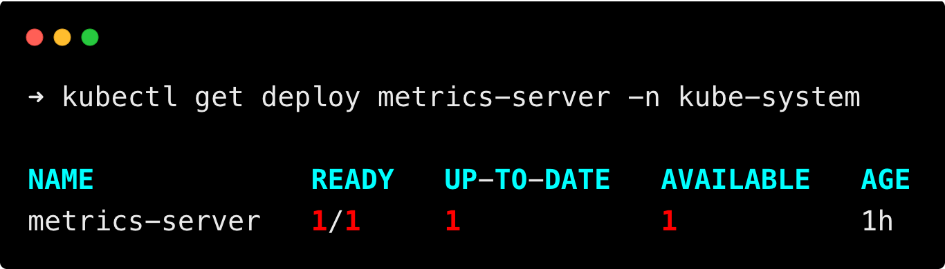 kubectl get deploy metrics-server -n kube-systemYou will get the following output.