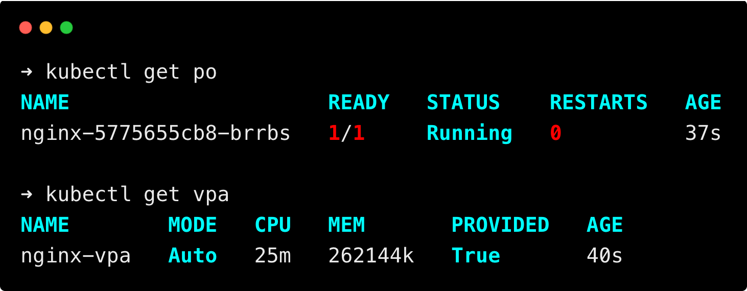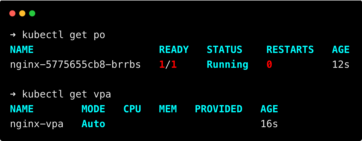 Then run the following commands to check if the pod nginx is running, and the VPA resource has been created.