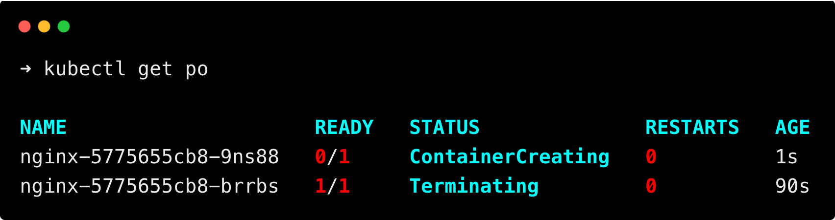 After some time, you can see a new pod is created, and the old pod is terminating, as shown below.