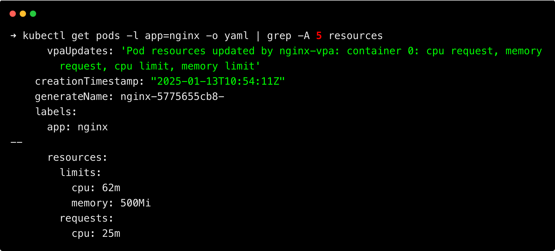 You can see the resource requests and limits of the pod have been updated to the recommended values by the VPA.