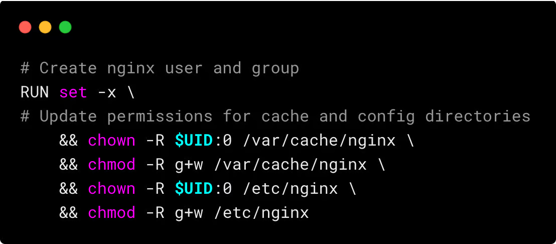 The Nginx Unprivileged Dockerfile is a classic example of this scenario. It is configured to run Nginx as a non-root user.