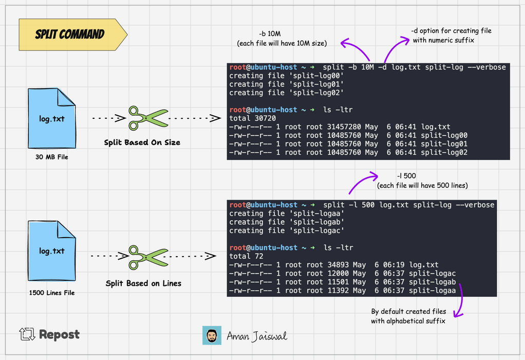 The split command is a lifesaver when dealing with large files, whether you're processing log data, backing up important files, or preparing data for parallel processing.